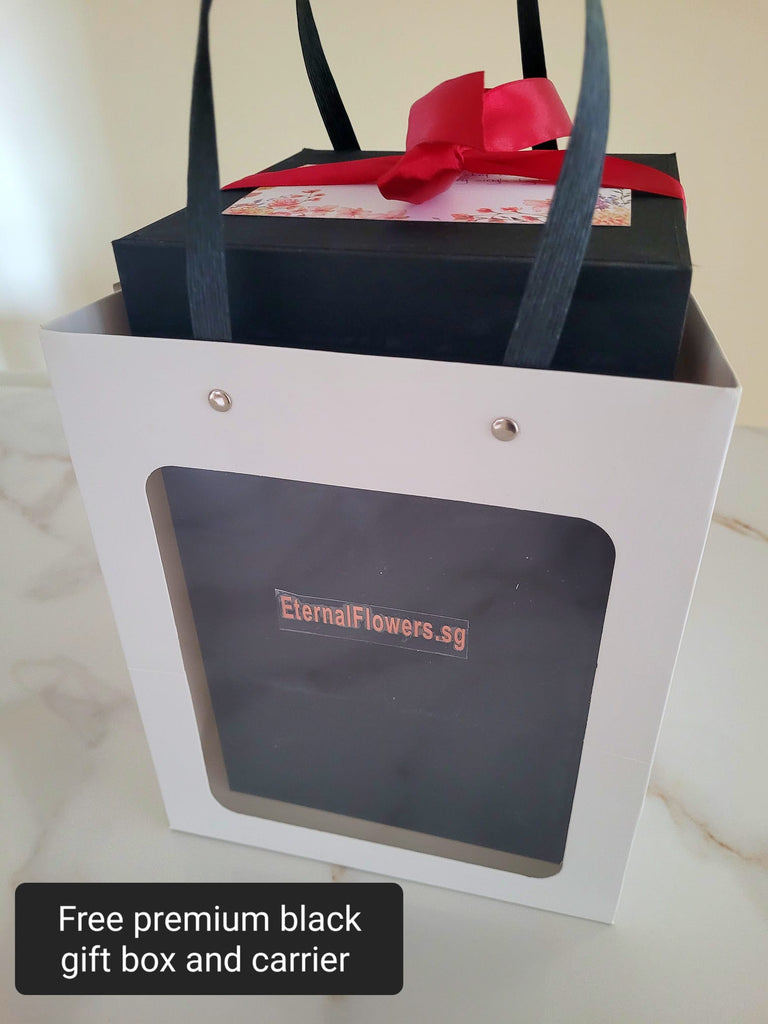 Product photos are purely for illustration purposes. Please note that each bloom and bud is unique. Since all designs are handcrafted, there may be variations in the colors and handiwork. However, be rest assured that the overall look and vibe of the arrangement will stay the same. We take extra care to ensure that our bell jars come with a tight-fitting seal to ensure safety and prevent moisture from seeping in. (Be cautious when removing the carrier box, only remove the ribbon tied on the glass dome after taking out from its transparent carrier box.)*