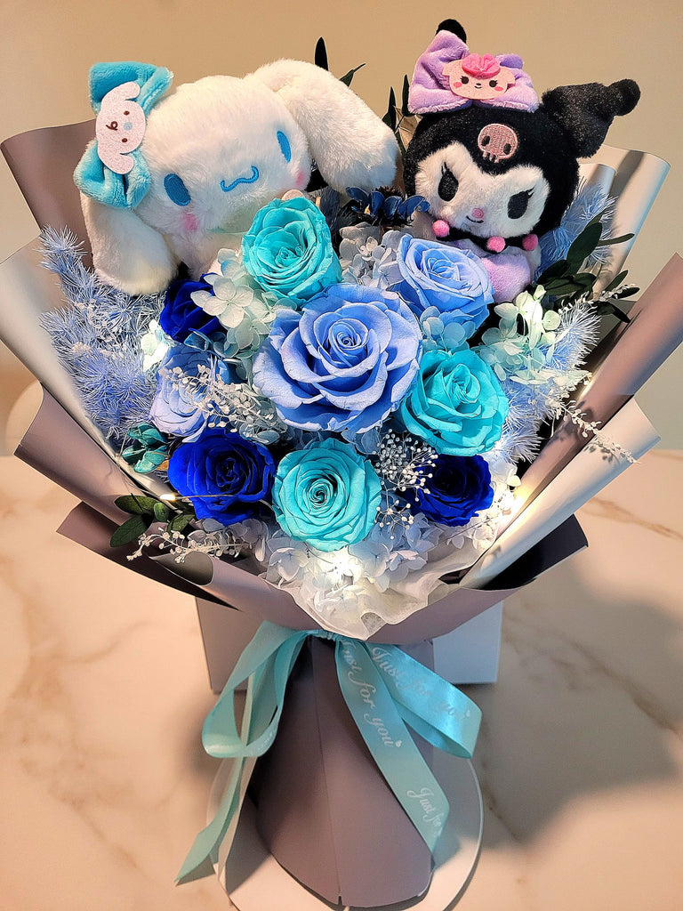 Sweetly arranged preserved blooms in the shade of Blue, Tiffany and Dark Blue color, hand-tied and layered with 2-colored premium wrapping papers, this bouquet shall surely bring smiles with joy. Our preserved flowers are made from 100% real and natural flowers that have been preserved to retain their suppleness and textures. They can last from months to years with proper care.