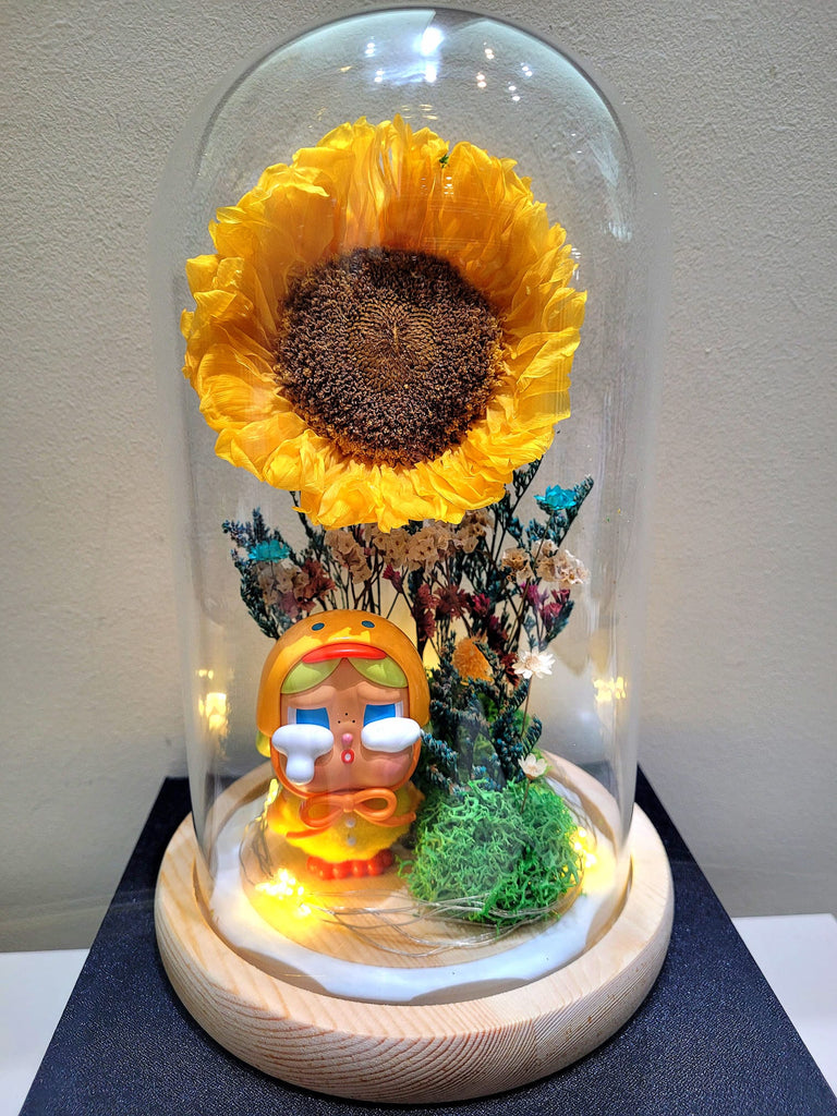 Embrace the delightful sight of the Preserved Sunflower Dome with Premium Popmart Crybaby as a decorative figure. It's a perfect gift to celebration love and friendship.