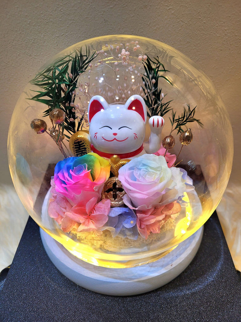 Bring good fortune and affection to your festivities! Enhance your special event with the enchanting allure of the Lucky Cat embellished with Rainbow Roses in a Customized LED Preserved Flowers Dome from Eternal Flowers Singapore. A genuinely distinctive and propitious present to honor your blissful occasions.