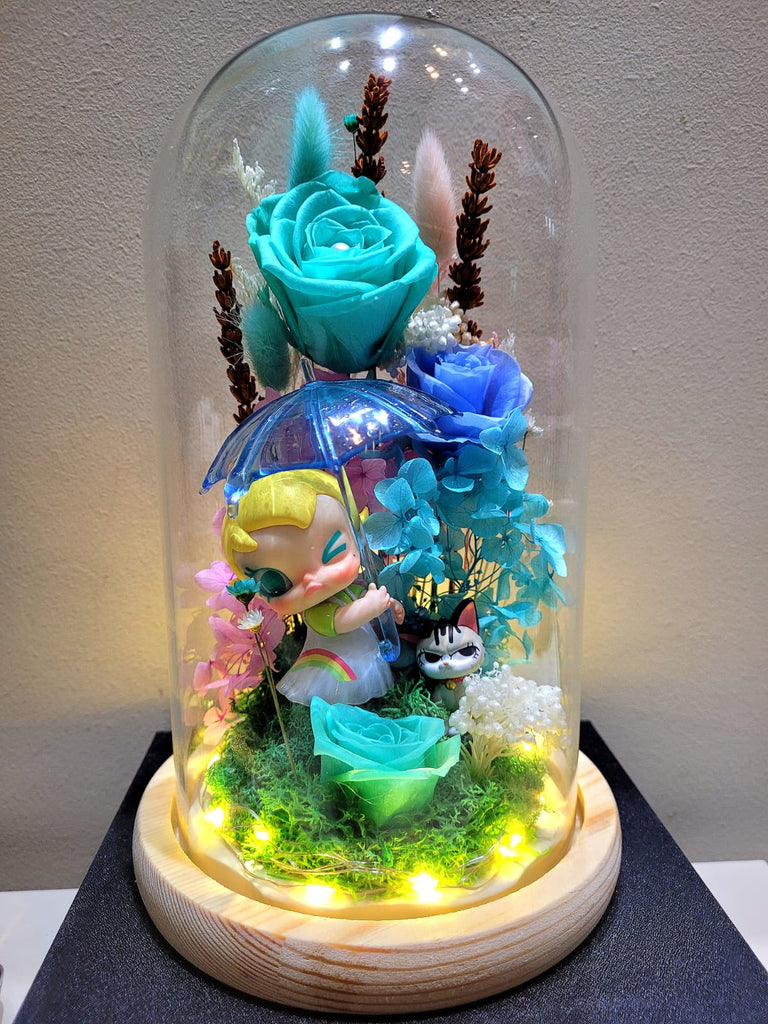 This beautifully arranged preserved flower dome comes with yellow matching roses and also a beautiful popmart Molly plush / figurine. Get this gift and send it to someone special now.