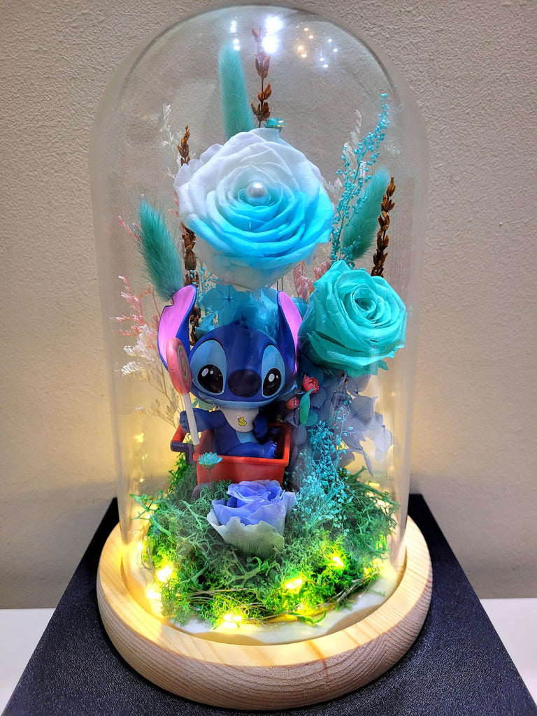 This is a special limited edition of the Disney series featuring Popmart Stitch and Preserved Flower Dome With Multi Blue Roses. Send this gift to someone special before it sold out!