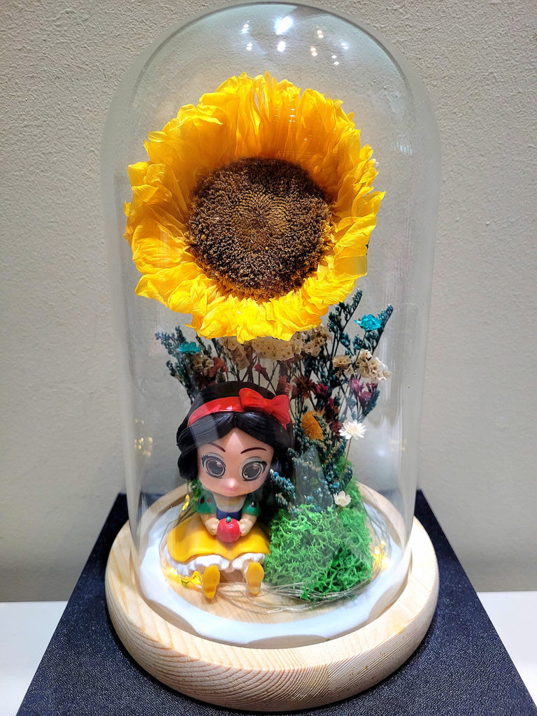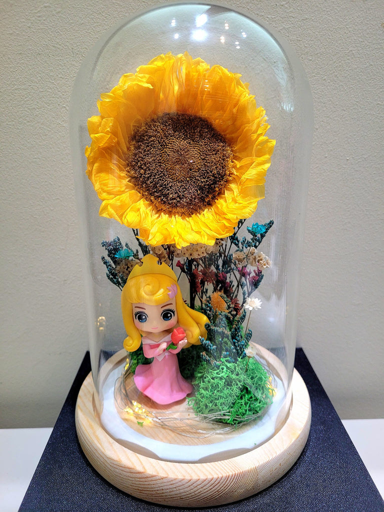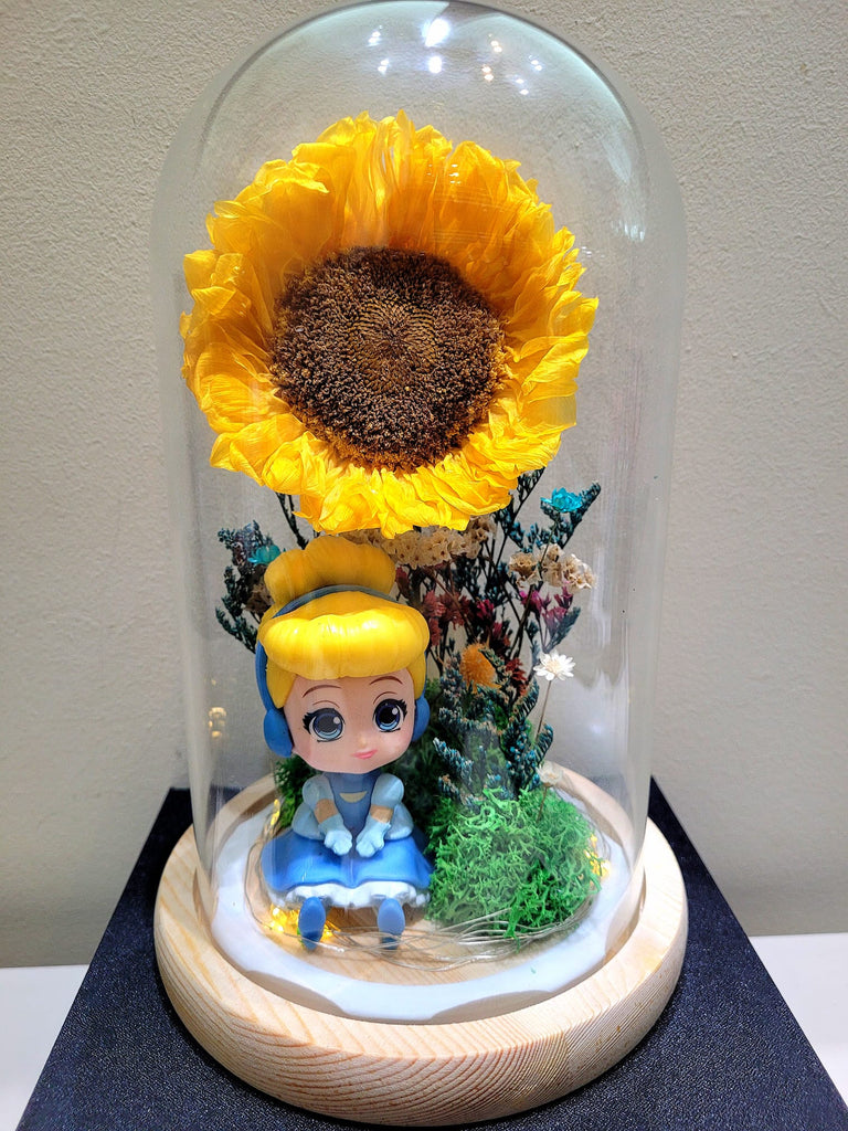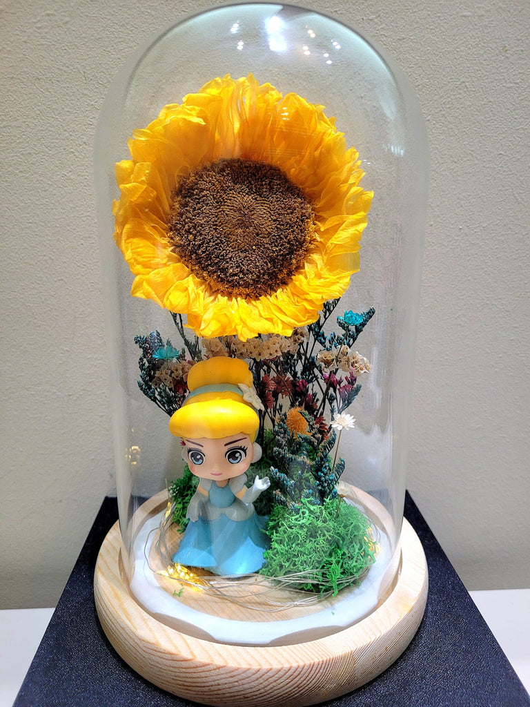 Embrace the delightful sight of the Preserved Sunflower Dome with Disney Princess as a decorative figure. It's a perfect gift to celebration love and friendship.