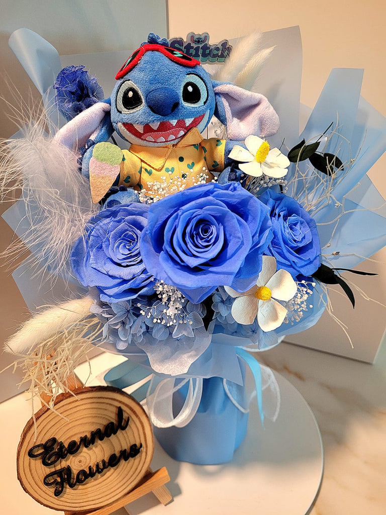 Immerse yourself in the peaceful beauty and timeless allure of our Timeless Romance Blue Preserved Roses Bouquet, expertly created to bring about calmness and elegance, offered exclusively at Eternal Flowers Singapore. Enhance it further with a Stitch plush toy.